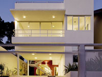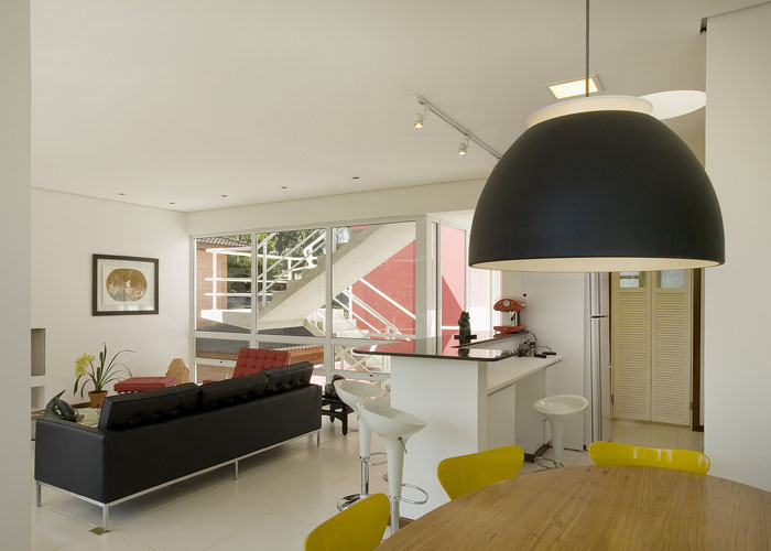Todo o programa da casa se desenvolve no nível superior. Foi criado um vazio entre os dois corpos desse pavimento para diminuir o aspecto estreito e comprido da construção. Nele estão as escadas em balanço.