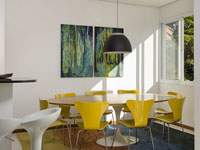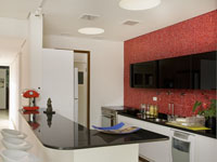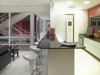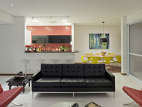 Buscou-se, também, a máxima continuidade de espaços, integrando sala e cozinha, assim como estar íntimo e escritório, através da galeria de entrada numa composição espacial em diagonal.