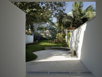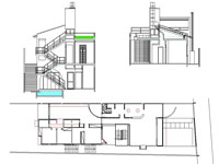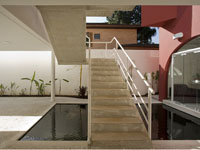 On the ground floor, one meter (3,23 ft) higher than the street, there's an access, garage, studio and working areas. On this level , there's also a little pool filled with carps, from which a flight of stairs in reinforced concrete emerges, leading to the upper level, with all the house accommodations: access gallery, rooms, kitchen, verandas, office, 3 bedrooms and bathrooms. The office and the third bedroom open to the upper garden at the end of the ground.