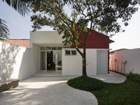 A void was designed in order to diminish the strong predominance of the longitudinal over the transversal direction, where the carp pool and stairs are located, separating the building in two bodies. The volume with bedrooms (upstairs) and studio (downstairs) was painted red. Other external walls are white. The purpose was to visually enhance the house and, at same time, to harmonically insert it on the ground.