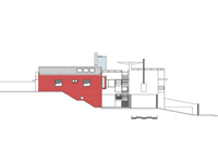 A casa parece maior do que é. Há um terraço na cobertura, acessível pelo prolongamento das escadas. O bloco que contém a área íntima com os quartos foi, em vermelho, evidenciado como “anexo” dos volumes brancos do resto da construção.